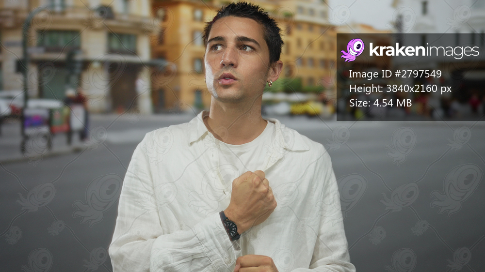 Young man in white shirt gestures energetically on a busy urban street with blurred buildings and people in the background.