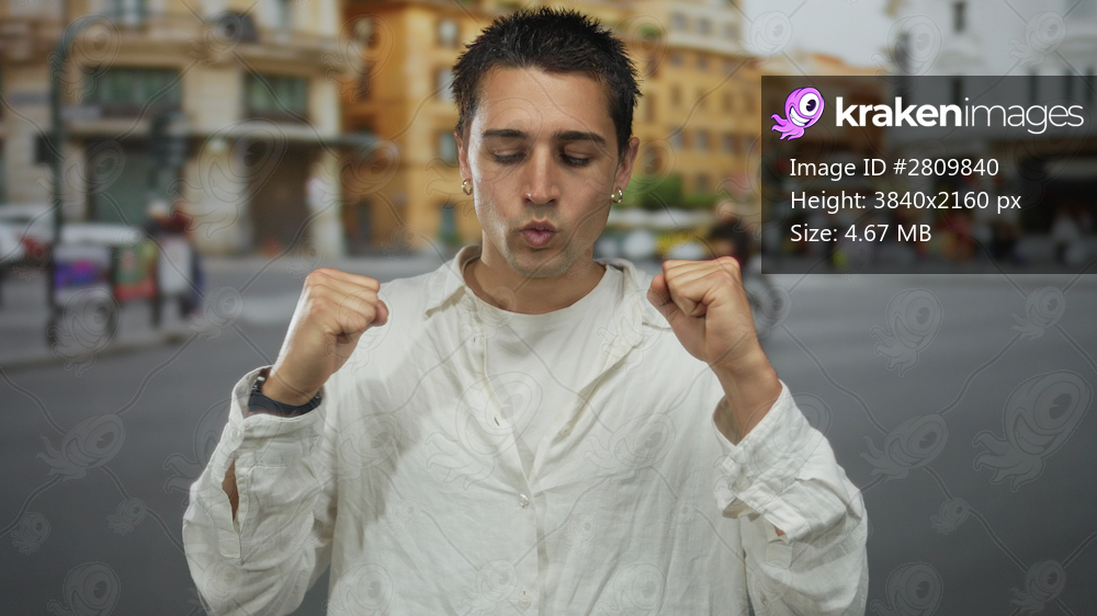 Young man in white shirt gestures energetically on a busy urban street with blurred buildings and people in the background.