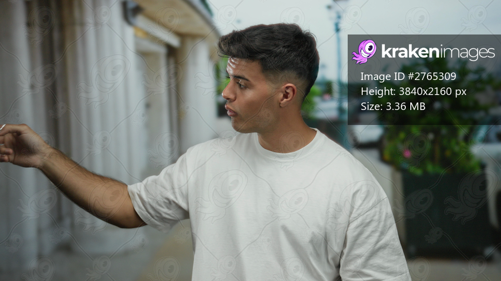 Young man in white shirt gestures on bustling city street lined with columns and greenery, showcasing expression and interaction in urban setting.