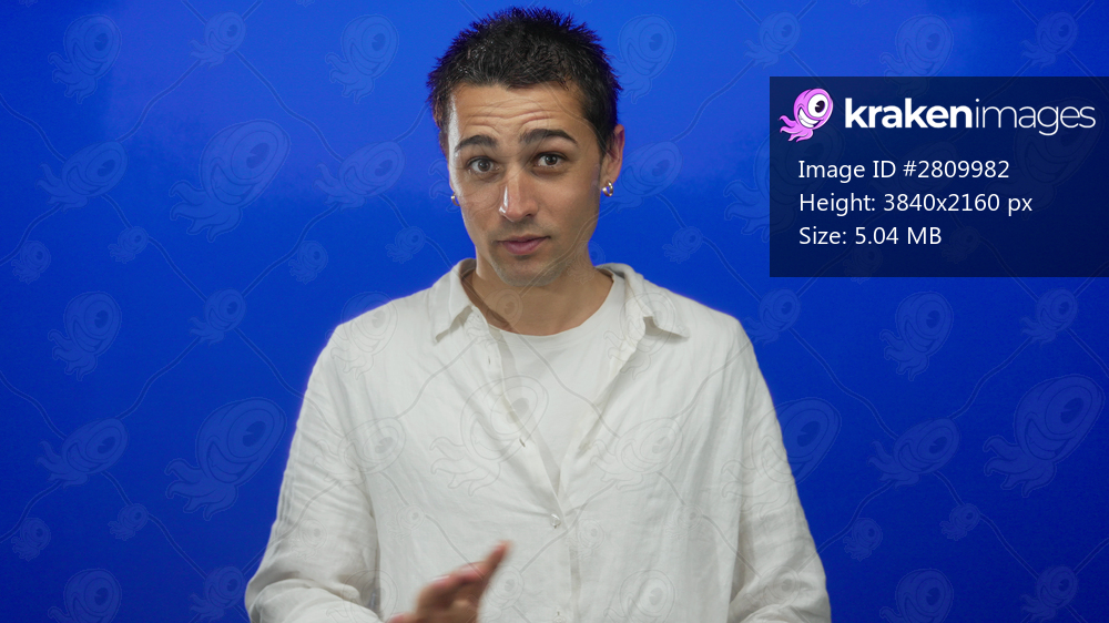 Young man in white shirt gesturing and speaking against vibrant blue background wall