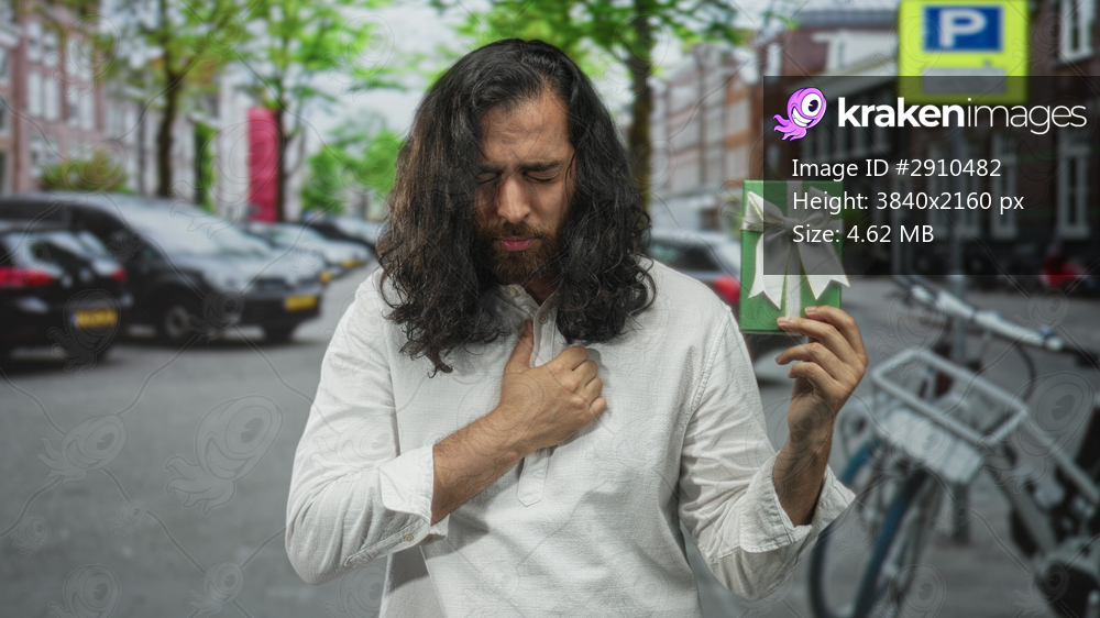 Young man in white shirt holding green gift box with bow coughing into fist on a city street; concern illness giving.