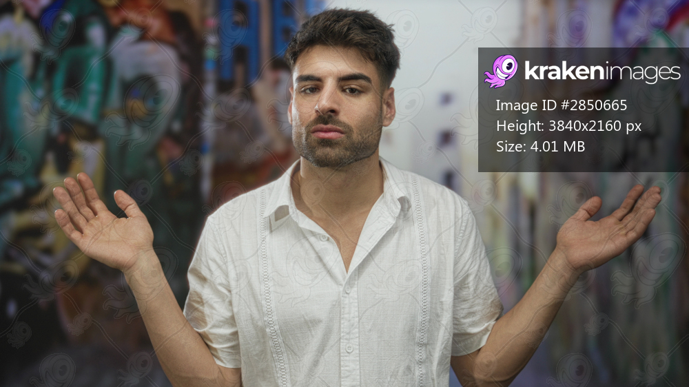 Young man in white shirt holds bare hands up before graffiti wall on urban street; uncertainty doubt.
