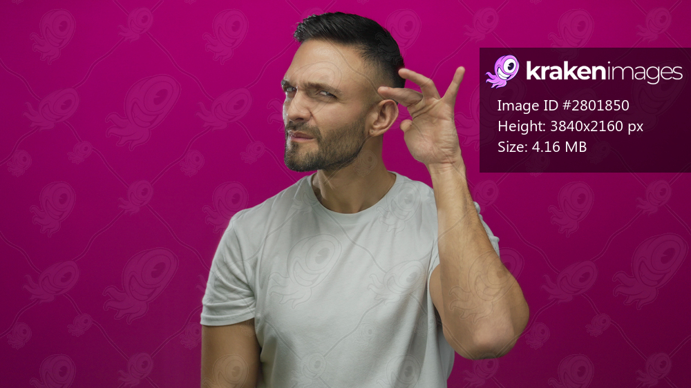 Young man in white shirt listening intently with hand to ear against vibrant pink background conveying curiosity and engagement in a dynamic setting.