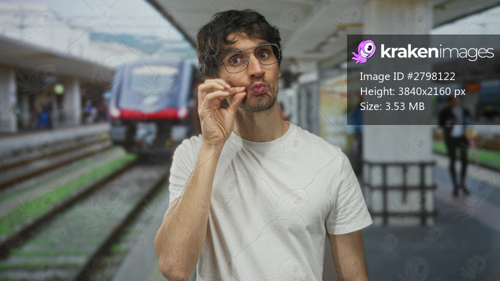 Young man in white shirt makes ok sign with hand at busy train station platform in daylight; approval.