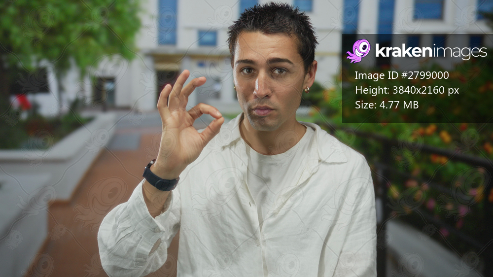 Young man in white shirt making an okay gesture outdoors in a garden setting, expressing affirmation and confidence with a background of bright flowers and modern architecture. - Kraken Images