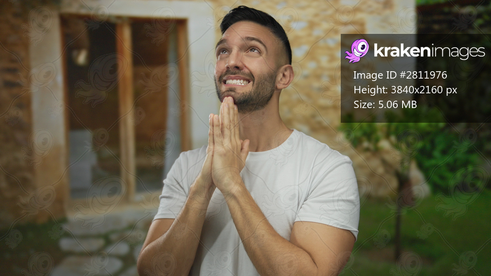 Young man in white shirt smiling with hands clasped in prayer in front of a rustic mediterranean house with stone walls and greenery.