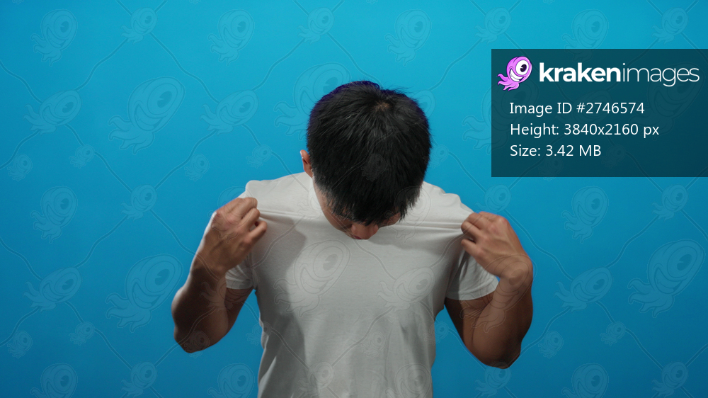 Young man in white shirt stands against isolated blue background looking down with a contemplative expression, capturing simplicity and focus.