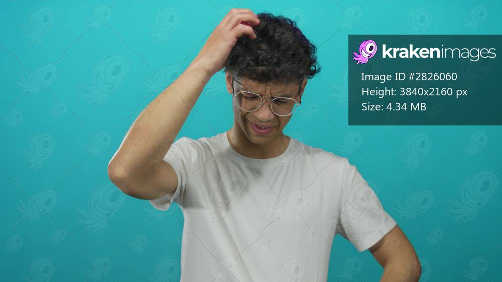 Young man in white shirt wearing glasses scratches hair in studio; confusion uncertainty doubt perplexity.