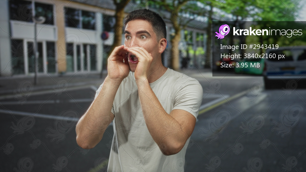 Young man in white t shirt gesturing with hands and cupped mouth on a sunny city street near parked car and storefronts, speaking; spontaneous surprise. - Kraken Images