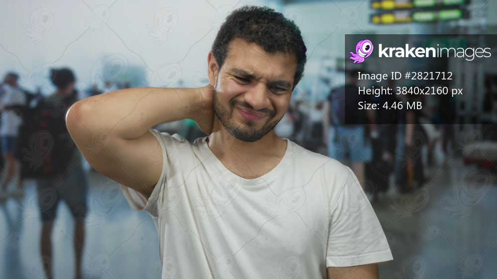 Young man in white t shirt grimacing and clutching neck with hand at busy airport terminal; discomfort.