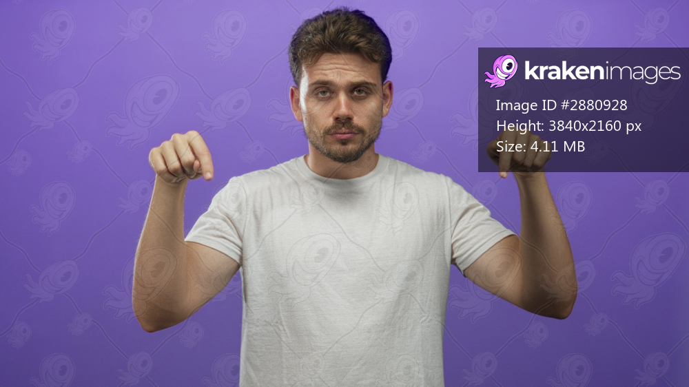 Young man in white t shirt pointing both index fingers down in purple studio with neutral gaze and relaxed posture; seriousness.