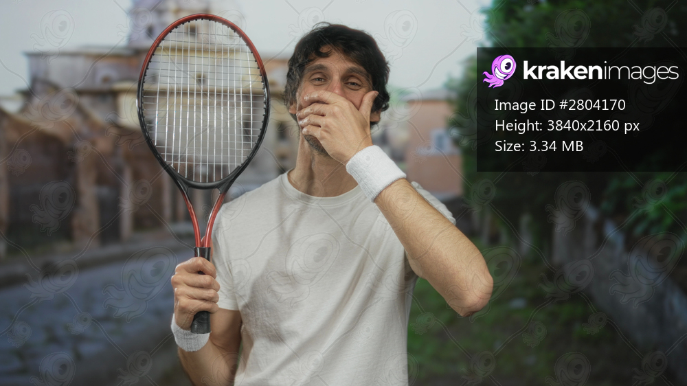 Young man in white wristbands holds red and black tennis racket and places finger to lips for silence on old town cobblestone street; silence.