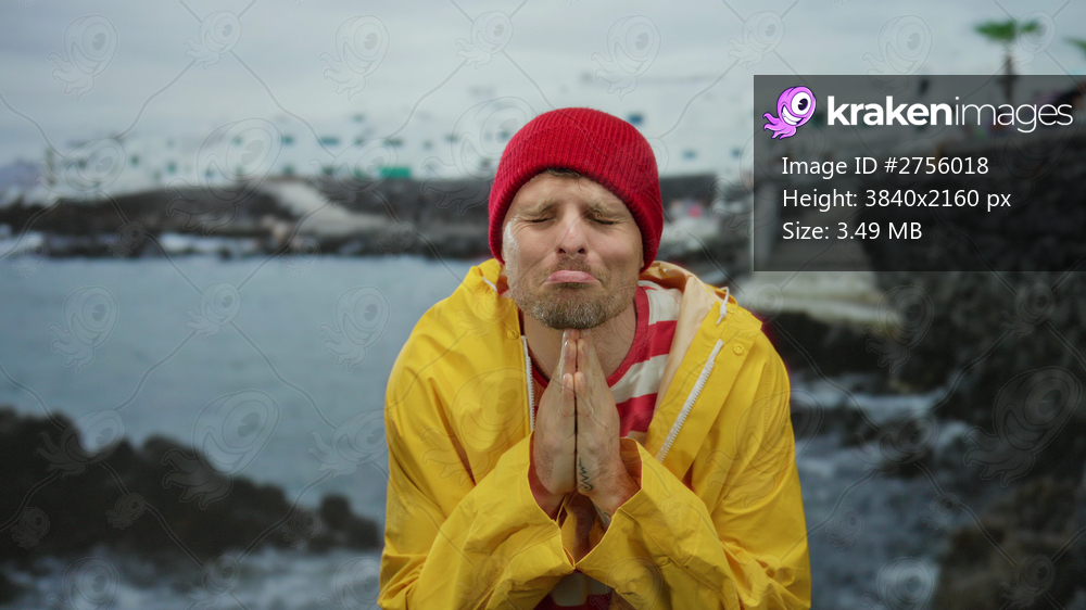 Young man in yellow jacket and red beanie on seaside with hands clasped as if in prayer against ocean backdrop.