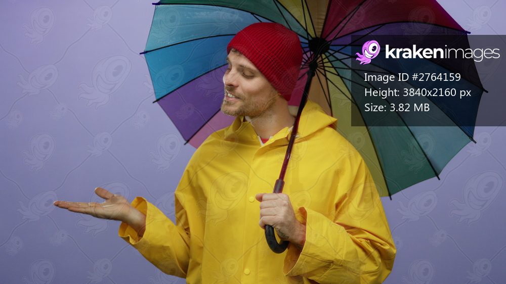 Young man in yellow raincoat holds colorful umbrella against isolated purple background, extending palm with a confident, handsome expression and charming demeanor. - Kraken Images