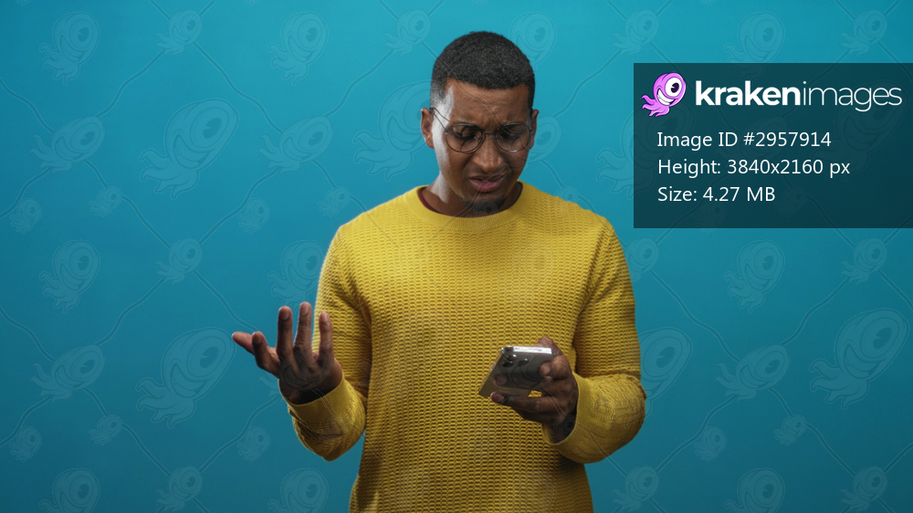 Young man in yellow sweater holding smartphone with left hand palm up while looking at screen in studio; frustration.