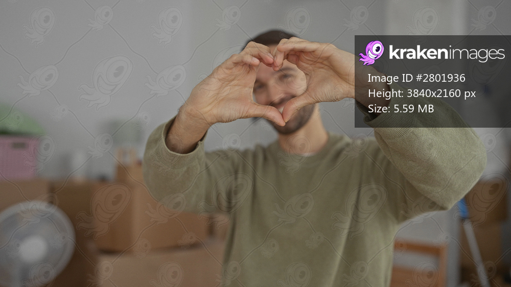 Young man indoors forming heart gesture with hands in new home surrounded by cardboard boxes expressing happiness and excitement.