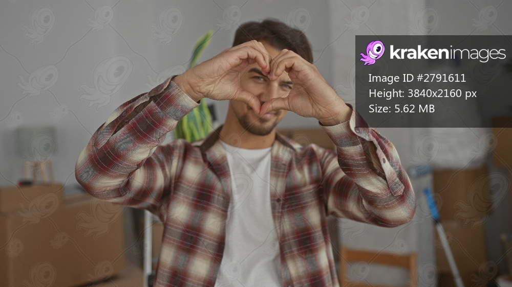 Young man indoors forming heart shape with hands in new apartment surrounded by moving boxes representing love and excitement of moving day in personal living space - Kraken Images