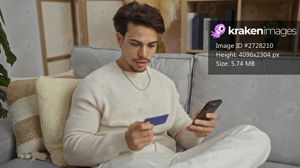 Young man indoors holding credit card and phone sitting on couch in modern living room setting background of shelves and cushions suggests relaxed home environment - Kraken Images