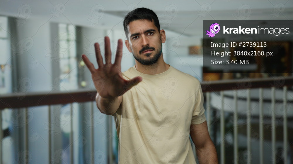 Young man indoors pointing no with finger in modern hotel environment, hispanic features and casual attire, conveying refusal and awareness.