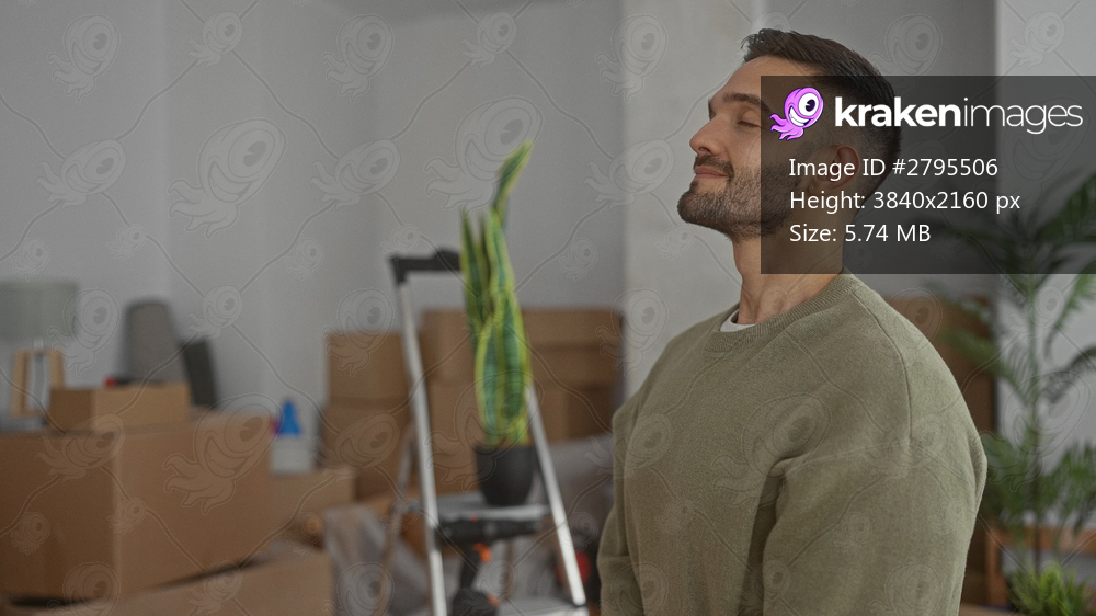 Young man indoors relaxing in new home surrounded by cardboard boxes and plants symbolizing fresh start and excitement of moving in