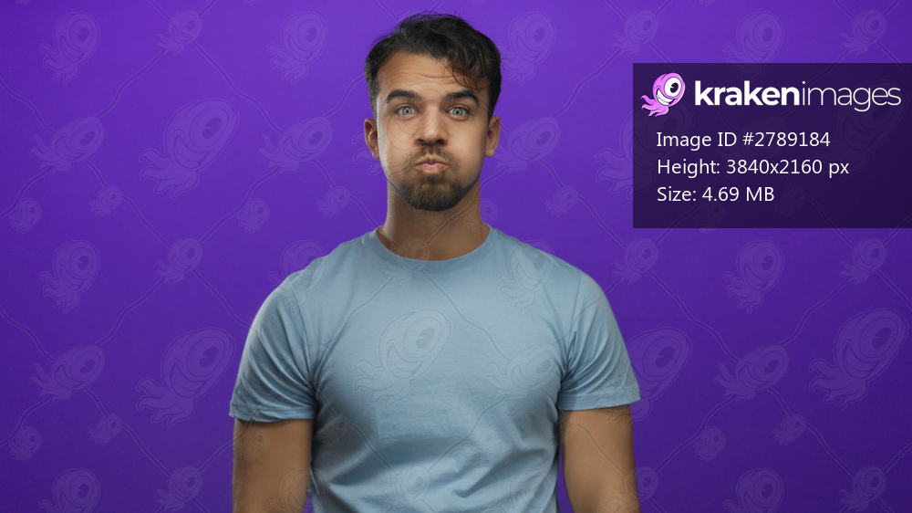 Young man inflates his cheeks and touches them with fingers in front of isolated purple background displaying playful expressive gesture.