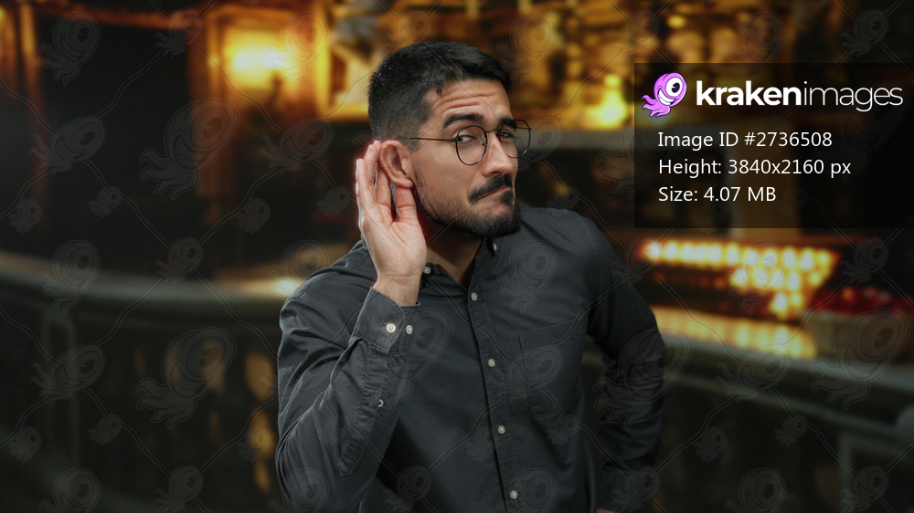 Young man inside church wearing glasses and shirt making listening gesture with warm indoor lighting and blurred background