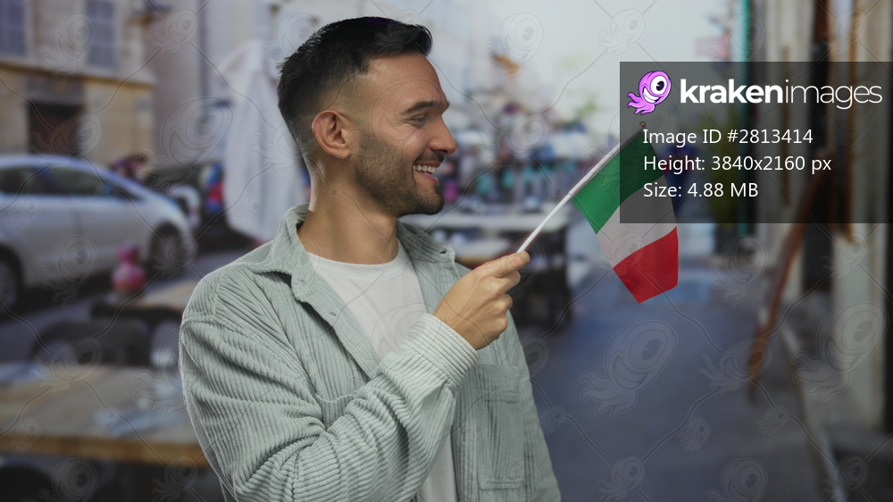 Young man with italy flag smiling happily on a bustling urban street showcasing vibrant city life.