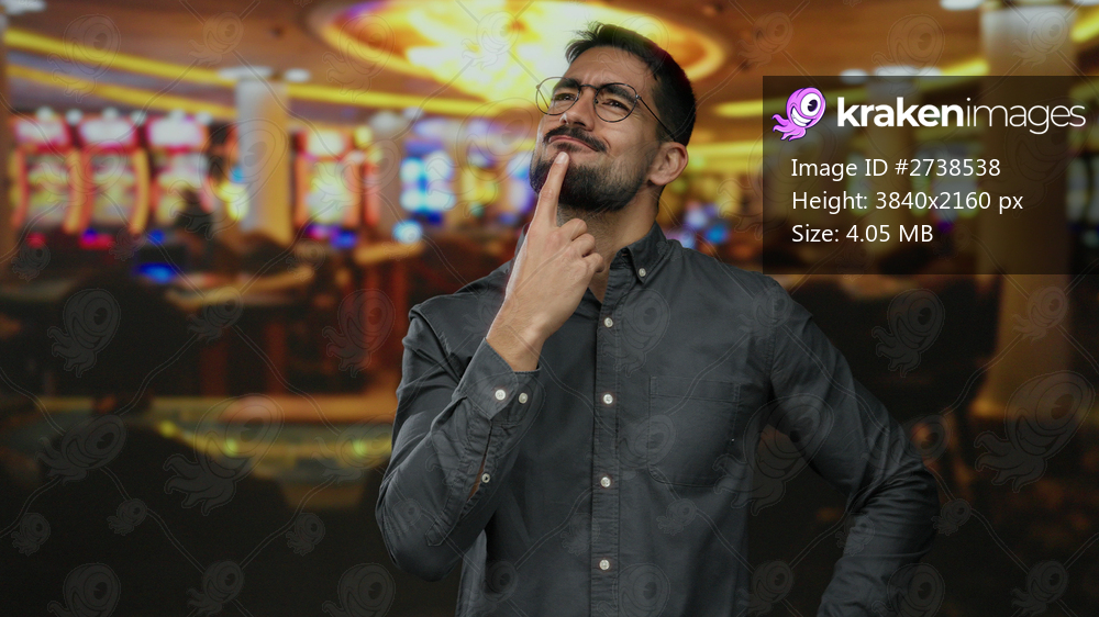 Young man with joyful expression making idea gesture in a lively casino backdrop filled with vibrant slot machines and glowing lights, capturing a moment of inspiration and excitement. - Kraken Images
