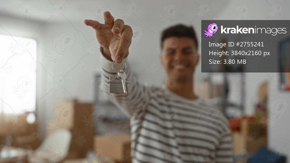 Young man with keys standing in new home, smiling in modern apartment.