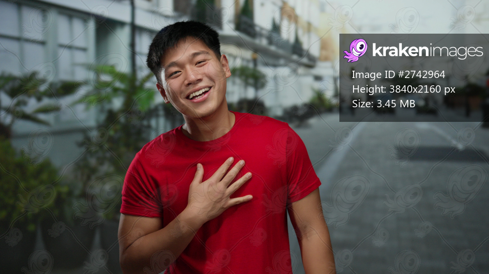 Young man laughing joyfully on a city street wearing red shirt embodying happiness and energy in an urban outdoor environment