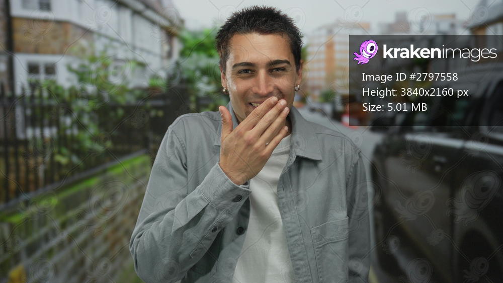 Young man laughing on a city street, surrounded by urban architecture, casual attire, and cars parked along the roadside in a lively moment outdoors.