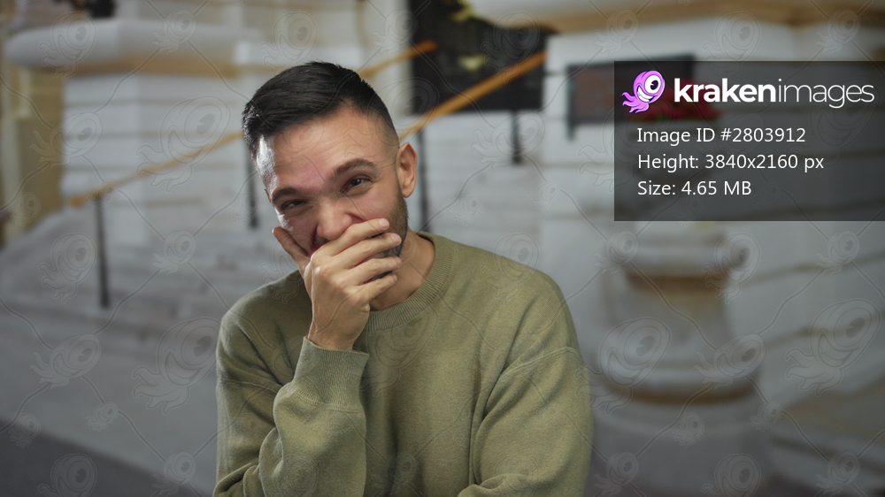 Young man laughing outdoors in an urban city setting, wearing casual clothing and exhibiting joyful emotions near a stylish building.
