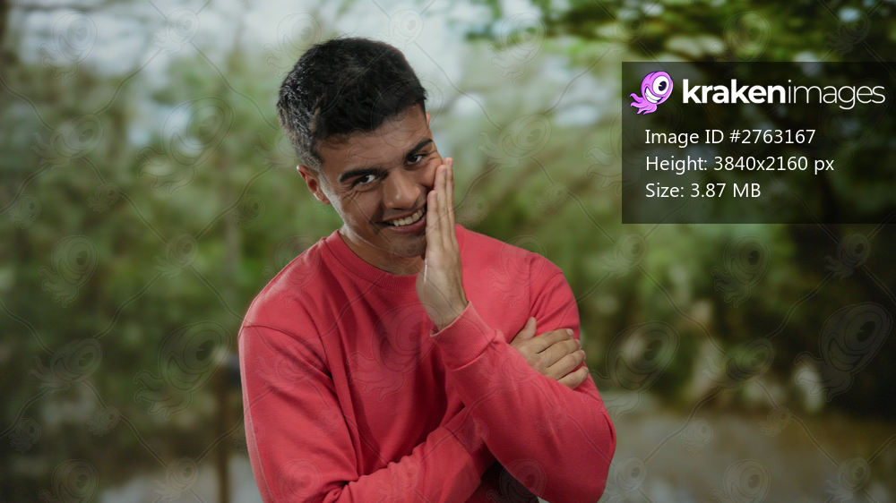 Young man laughing outdoors in vibrant park setting, wearing red shirt, caught in candid moment of joy against a backdrop of lush greenery and soft natural light - Kraken Images