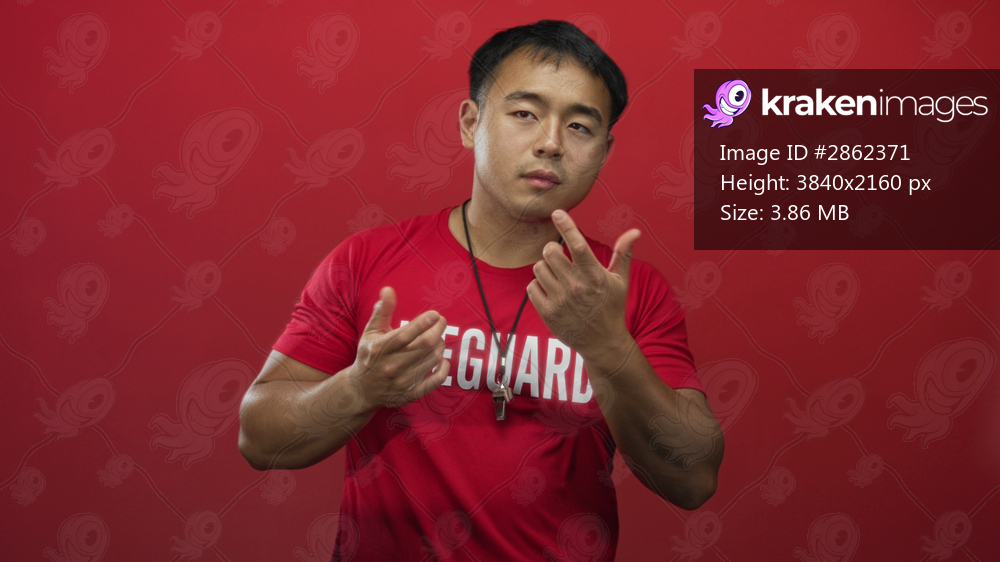 Young man lifeguard adjusts whistle on red shirt in studio by crimson wall with focused gaze and subtle hand movement; readiness.