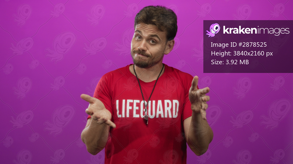 Young man lifeguard in red shirt smiling and gesturing with hands and whistle in magenta studio; playful confidence.