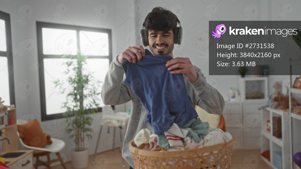 Young man listening to music while folding laundry in a bright, homey room, showcasing a relaxed and domestic atmosphere.