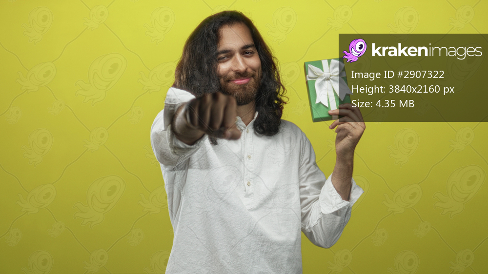 Young man with long dark hair and beard holding green gift box while punching forward with his fist in a yellow studio; celebration confidence.