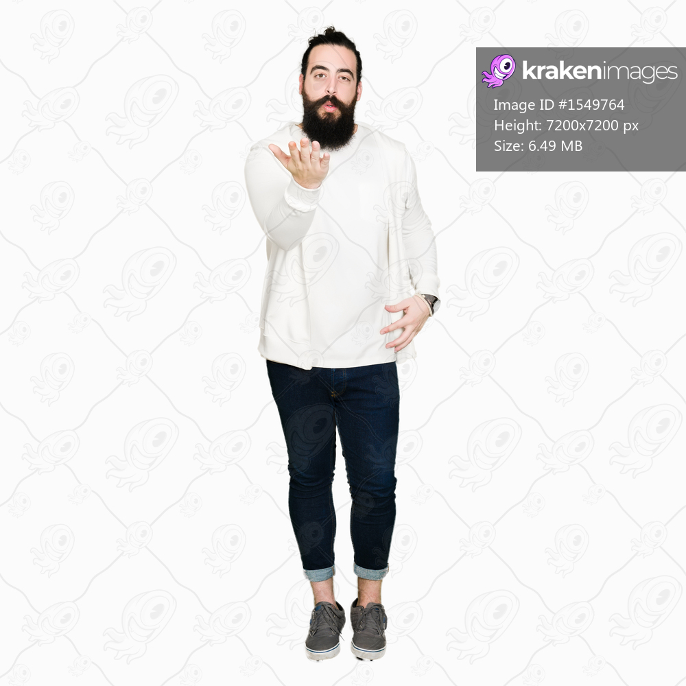 Young man with long hair and beard wearing sporty sweatshirt looking at the camera blowing a kiss with hand on air being lovely and sexy. Love expression. - Kraken Images