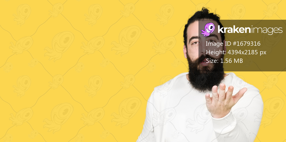 Young man with long hair and beard wearing sporty sweatshirt looking at the camera blowing a kiss with hand on air being lovely and sexy. Love expression. - Kraken Images
