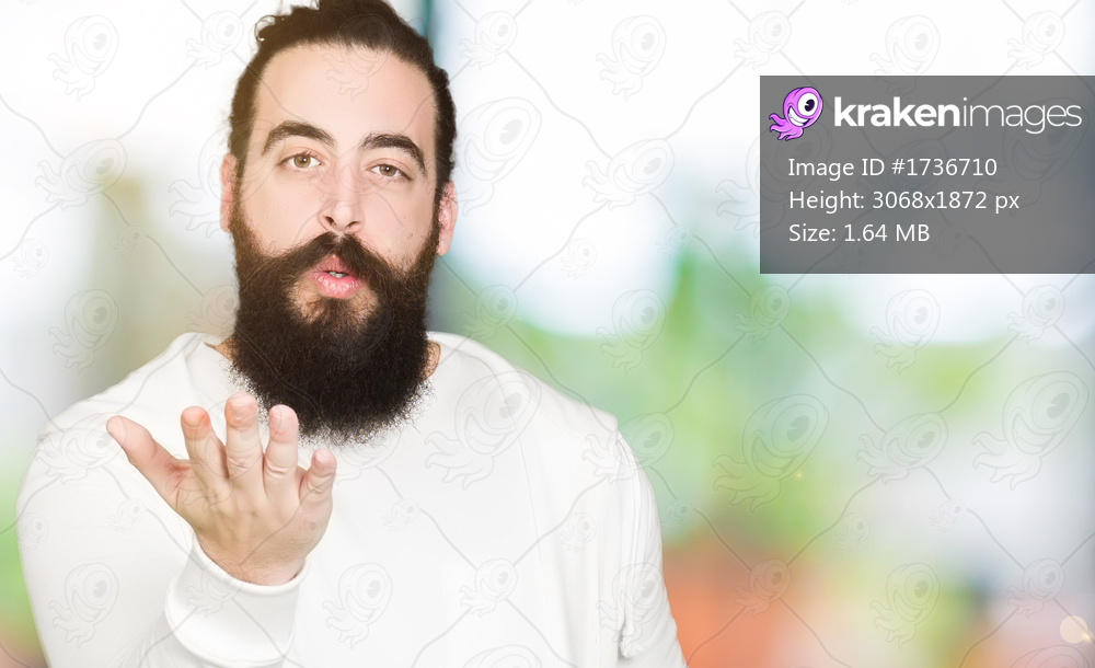 Young man with long hair and beard wearing sporty sweatshirt looking at the camera blowing a kiss with hand on air being lovely and sexy. Love expression. - Kraken Images