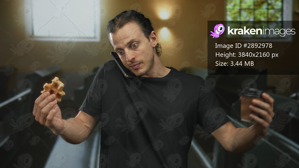 Young man with long hair holding waffle and coffee while balancing smartphone at ear in church; distracted multitasking.