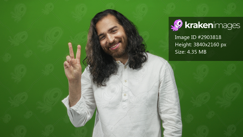 Young man with long hair and white shirt showing peace sign with hand in green studio; playful optimism.