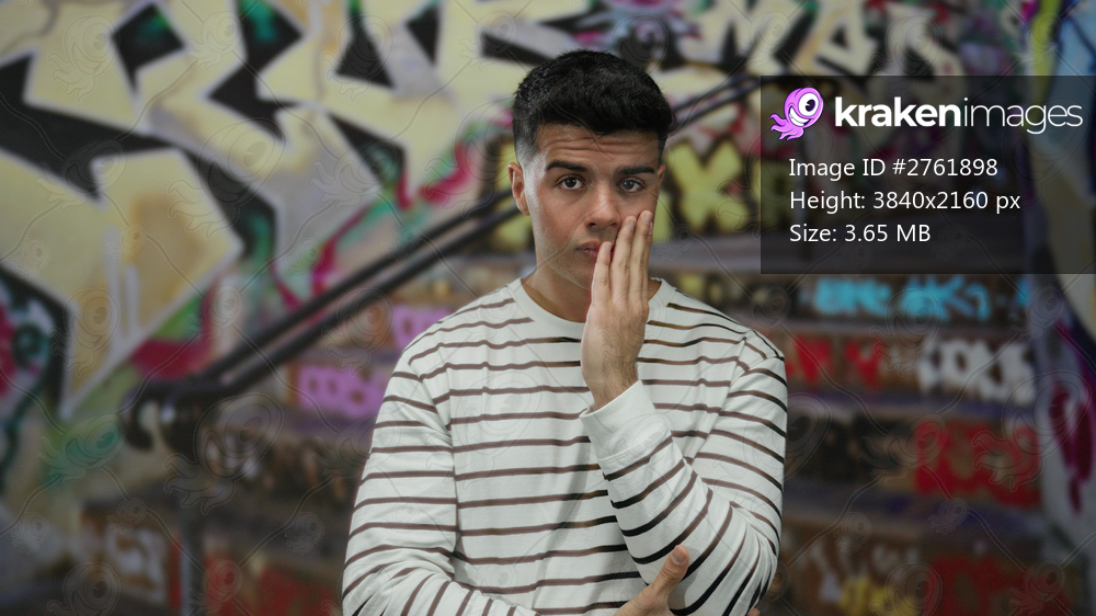 Young man looking concerned on a city street with vibrant graffiti, wearing a striped shirt, showcasing a worried expression, contrasting against the urban outdoor surroundings. - Kraken Images