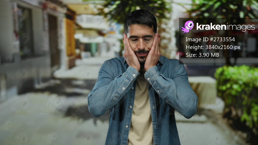 Young man looking stressed outdoors in an urban street, covering his face with hands, conveying emotion and isolation in a public city setting.