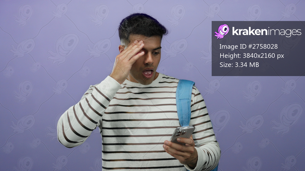 Young man looking surprised at phone in front of purple background wearing striped shirt and blue backpack