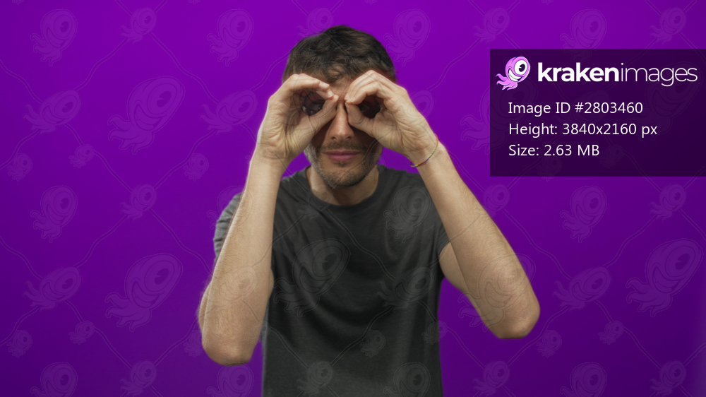 Young man looking through binocular gesture with both hands at purple studio wall; curiosity exploration discovery imagination.