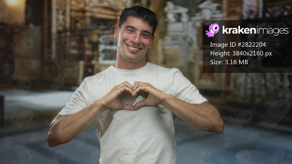 Young man makes heart shape with hands near an ornate marble altar in historic church sanctuary; love.