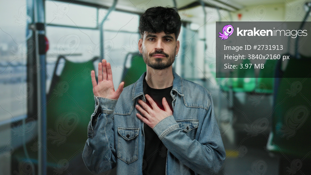 Young man making a pledge with hand on chest inside a bus, wearing a denim jacket, showcasing a thoughtful expression, demonstrating a solemn commitment in an urban transport setting. - Kraken Images