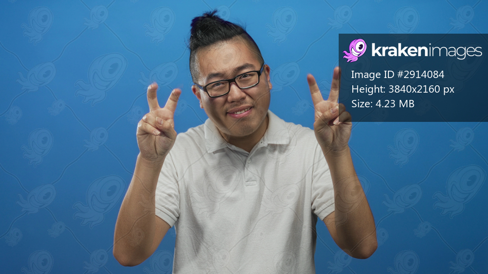 Young man making air quotes with raised fingers and wearing white polo in blue studio; playful sarcasm.