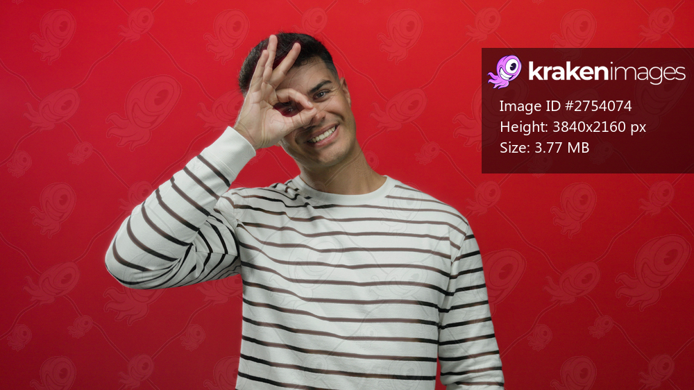 Young man making an ok gesture with one hand over his eye against a vibrant red background, wearing a striped sweater, conveying a playful and confident expression. - Kraken Images